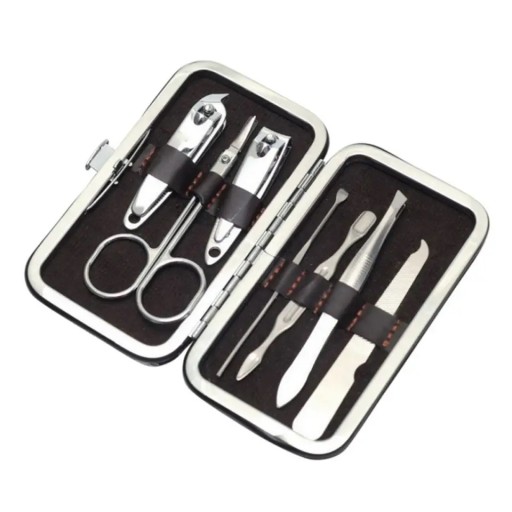 - Zestaw zawiera 7 elementów: obcinaczki, obcinaczki boczne nożyczki, pilnik, pęseta, 2x radełko