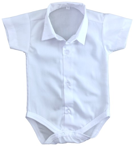 Białe wizytowe koszulo-body z kołnierzykiem i krótkimi rękawkami dla chłopczyka.