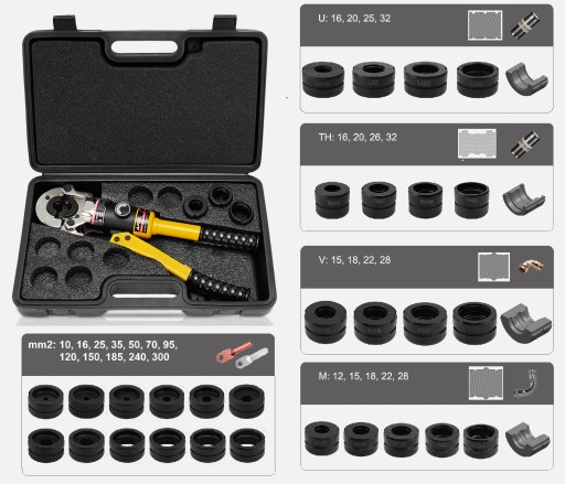 - Rozmiary kamieni w zestawie: V15mm, V18mm, V22mm, V28mm, M12mm, M15mm, M18mm, M22mm, M28mm, U16mm, U20mm, U25mm, U32mm, TH16mm, TH20mm, TH26mm, TH32mm, 10, 16, 25, 35, 50, 70, 95, 120, 150, 185, 240, 300 mm2