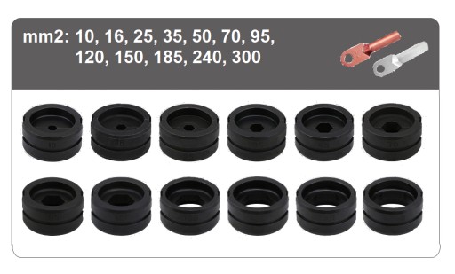 - Matryce sześciokątne w rozmiarach: 10, 16, 25, 35, 50, 70, 95, 120, 150, 185, 240, 300 mm2