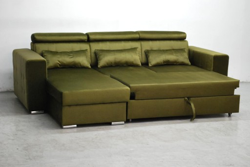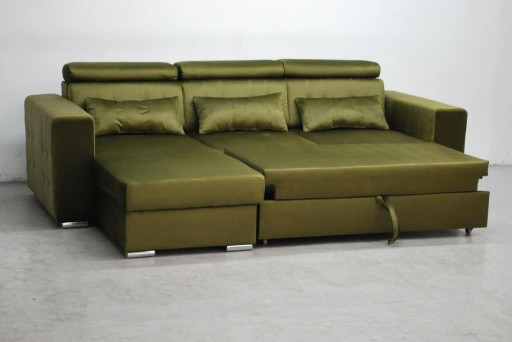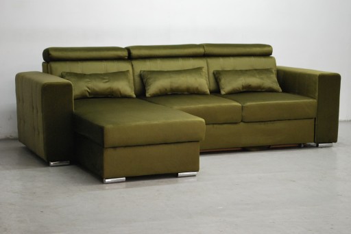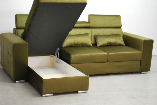 Narożnik jest fabrycznie nowy wykonany z wysokiej jakości tkaniny Monolith 38 - to wytrzymały i mocny, a przy tym wyjątkowo przyjemny w dotyku materiał welurowy. Do jego zalet należy obecność specjalnej warstwy ochronnej, która podnosi właściwości hydrofobowe. Water Repellent to specjalna warstwa ochronna, która tworzy na materiale Monolith hydrofobową powłokę. Jej zadaniem jest zabezpieczenie przed szybkim wsiąkaniem cieczy. Spowolnienie procesu absorpcji płynów przez tkaninę odbywa się poprzez skraplanie ich bezpośrednio na powierzchni materiału. Tkanina wykazuje dzięki temu odporność na wchłanianie rozlanej wody, kawy czy napojów, a tym samym minimalizuje ryzyko wchłonięcia cieczy w strukturę włókien. Uformowane na powierzchni materiału kropelki można łatwo zetrzeć, wykorzystując do tego miękką ściereczkę lub ręcznik papierowy. Narożnik jest w kolorze soczystej zeleni i stoi na chromowanych nóżkach Kanapa jest z funkcją spania oraz pojemnikiem. Narożnik ma nowoczesne regulowane zagłówki.