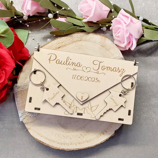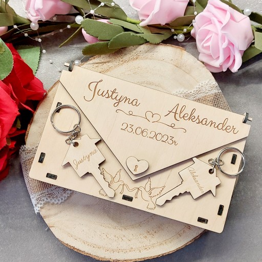 Nasza drewniana pamiątka w formie drewnianej koperty/pudełka to świetny pomysł na prezent dla nowożeńców, będzie to dla nich wyjątkowa pamiątka i zaskoczenie. Ta drewniana koperta zastąpi standardową papierową kopertę i kartkę z życzeniami. To doskonały pomysł na prezent ślubny od dziadków, rodziców, chrzestnych, rodziny czy też znajomych.