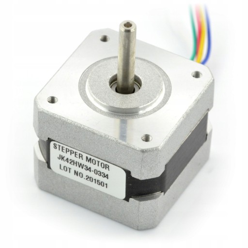 Specyfikacja silnika krokowego JK42HW34-0334 200 Rozdzielczość: 200 kroków/obr (1,8 °) Napięcie znamionowe: 12 V Pobór prądu na cewkę: 0,33 A Rezystancja cewki 34 Ω Indukcyjność uzwojenia: 46 mH Moment trzymający 2,3 kg*cm (0,22 Nm) Wyprowadzenia: bipolarne (cztery przewody) Średnica wału: 5 mm Masa: 200 g Standard: NEMA 17 Wymiary: 42 x 42 x 34 mm (bez wału)