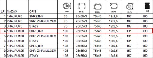 Komplet składa się z czterech kółek wyposażonych w mocowanie na płytkę. W skład kompletu wchodzą cztery koła o kodzie 1HALPU100K2, w tabeli pod pozycją 4.