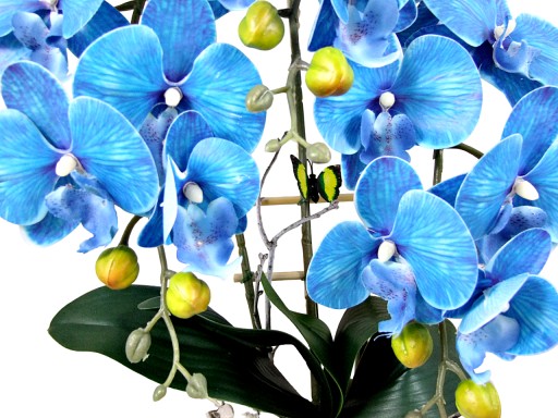 Ozdobna biała gałązka oraz sztuczny motylek sprawią iż nasz storczyk będzie wyglądał elegancko i bardzo naturalnie