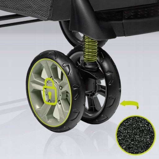 ✔️ Amortyzowane koła zapewniają maksymalny komfort i stabilizację jazdy, znacząco ograniczając wstrząsy podczas jazdy na nierównej powierzchni. Przednie koła o średnicy 18 cm, tylne 20 cm