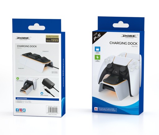 Stacja dokująca umożliwia jednoczesne ładowanie dwóch oryginalnych padów przeznaczonych dla konsoli PlayStation 5. Dzięki niej pady znajdą swoje miejsce i nie będą musiały leżeć na podłodze, a jednocześnie będą ładowane. Ładowanie odbywa się za pomocą portu USB, a zatem możesz ładować pady bezpośrednio z konsoli lub innych źródeł takich jak komputer PC, laptop czy ładowarka. 100cm kabel z zestawu ma 2 wtyki USB i umożliwia podłączenie stacji do portu USB. Stacja dokująca posiada funkcję szybkiego ładowania, aby ona działała, kabel zasilający musi być podłączony 2 wtykami USB do ładowarki o mocy minimum 2A. Stacja dokująca ma 2 podświetlane wskaźniki naładowania pada.
