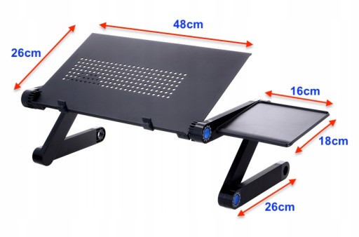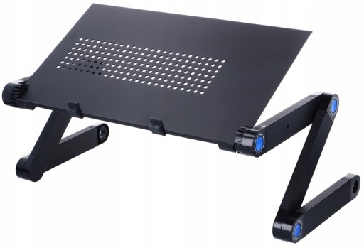 Aluminiowy stolik pod laptopa z podkładką pod mysz komputerową.