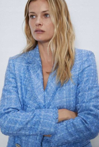 Piękna, teksturowana, dwurzędowa marynarka z ozdobnymi guzikami z kolekcji Zara o klasycznym fasonie w kolorze niebieskim.Zapinana na biżuteryjne guziki z cyrkoniami.Kołnierz z klapami.Z przodu dwie kieszenie z lamowaniem.Brzegi wykończone ozdobnym wystrzępieniem.Długi krój (za biodra).Wykonana z materiału strukturalnego.Wykończenie na wiskozowej podszewce.