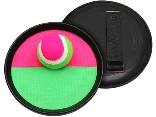 Zestaw zawiera 2 okrągłe paletki oraz piłkę. Gra polega na rzucaniu oraz sprawnym „chwytaniu” piłki na silny rzep, który sprawia, że złapana piłka nie spada na podłoże. Aby rzucić, należy ją oderwać od paletki. Komplet utrzymany w radosnej, różowo-zielonej kolorystyce, dostarczy wiele emocji i wywoła uśmiech u każdego uczestnika, bez względu na wiek czy płeć. Soczyste, neonowe barwy są przyjemne dla oka, przyciągną uwagę dziecka i zachęcą je do korzystania.