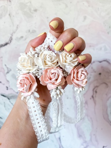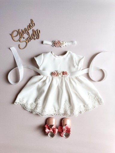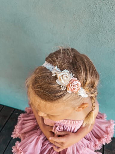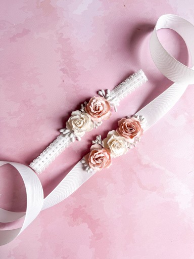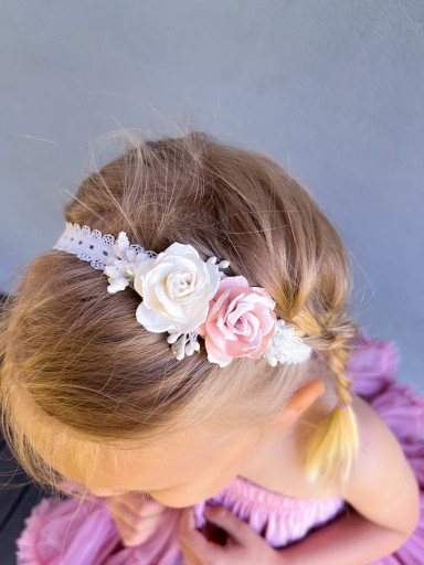 Ręcznie wykonany w Polsce zestaw składający się z opaski i paska w kolorze śmietankowej bieli i pastelowego różu. Zestaw ozdobiony delikatnymi różyczkami sprawdzi się idealnie na Chrzest, wesele czy sesję fotograficzną.