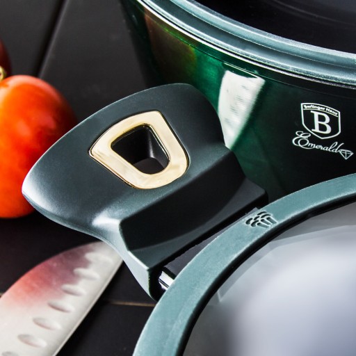 Garnki, patelnie i akcesoria z serii EMERALD METALLIC LINE firmy BERLINGE RHAUS wykonane są z wysokiej klasy kutego aluminium pokrytego wewnątrz powłoką tytanową o bardzo wysokim współczynniku twardości. Powłoka zewnętrzna w kolorze zielonym o charakterystycznym metalicznym połysku. Te atrakcyjne i modne naczynia wyposażone są standardowo w uchwyty typu SOFT TOUCH (silikon handle). Przystosowane do wszystkich rodzajów kuchenek: gazowa, elektryczna, ceramiczna, halogenowa, indukcyjna. System TURBO INDUCTION (bardzo szybko nagrzewają się) pozwala zaoszczędzić nawet 35% energii.