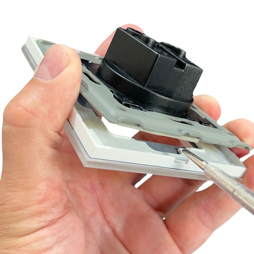 Przed zainstalowaniem w puszce moduł należy odłączyć od ramki przy użyciu śrubokręta: należy zlokalizować otwór u podstawy ramki, następnie delikatnie podważyć, aż oprawka odepnie się od modułu