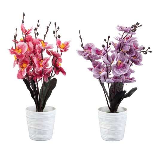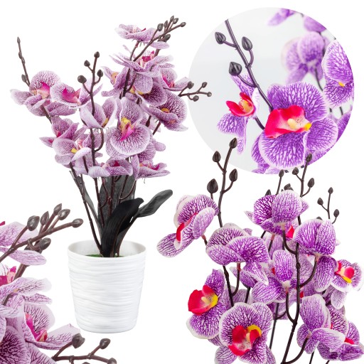 Doniczkowy storczyk pięcio-pędowy idealnie odwzorowujący piękno kwiatu żywego. Łodygi wykonane z elastycznego tworzywa sztucznego umożliwiają łatwe formowanie i uzyskanie odpowiedniego efektu wizualnego, zakończone zielonymi pączkami. Główki ułożone wokół łodygi dają efekt trójwymiarowy. Jest to idealna roślina dla wystrojów, w których ciężko utrzymać świeże kwiaty. Kwiat umieszczony w białej doniczce plastikowej wypełnionej sztuczną trawą.