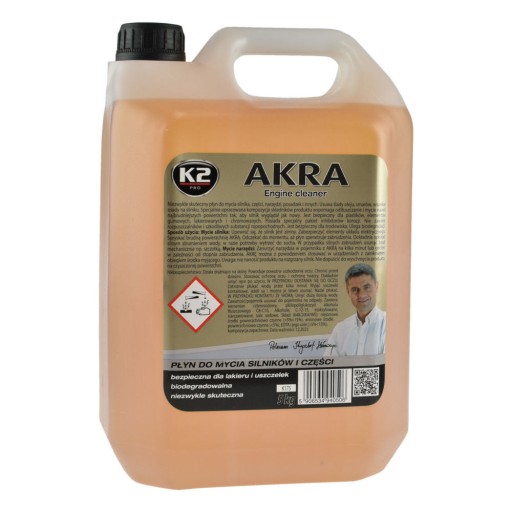 K2 AKRA – sprawdzony przez miliony klientów na całym świecie, płyn do mycia silnika i innych mocno zabrudzonych podzespołów samochodu. Jest produktem przeznaczonym do usuwania zaschniętych osadów, zacieków z płynów eksploatacyjnych, pyłów, stwardniałego brudu i lotnej rdzy. Oczyszcza silnik i inne podzespoły samochodu, a także służy do mycia narzędzi i czyszczenia urządzeń oraz powierzchni przemysłowych.