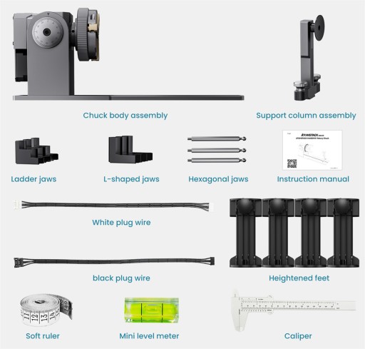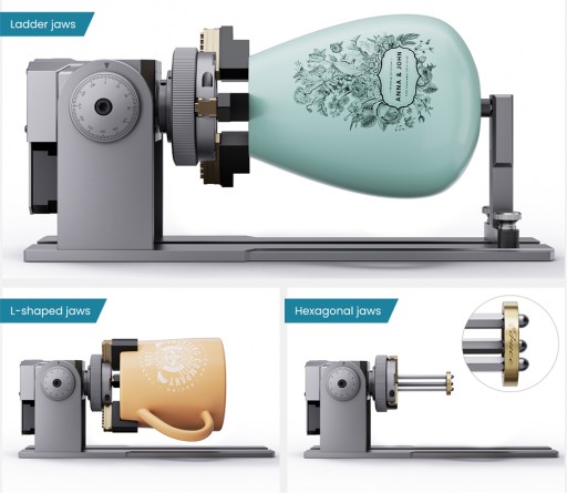 Uchwyt i rolka obrotowa ATOMSTACK MAKER R1 PRO są dostarczane z 3 zestawami szczęk, w tym szczękami drabinkowymi, szczękami w kształcie litery L, szczękami sześciokątnymi i rolką obrotową, która może mocno przytrzymać obiekt, aby grawerować więcej obiekty heteromorficzne.