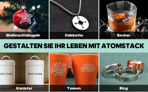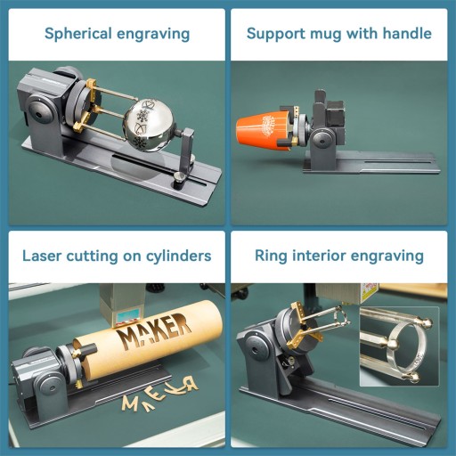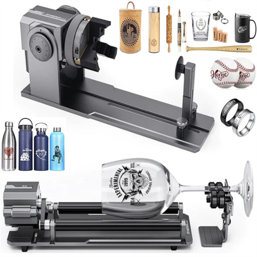 Za pomocą laserowego wałka obrotowego ATOMSTACK MAKER można grawerować cylindry, puszki, okrągłe drewniane patyczki itp. (1-130 mm); Przedmioty o specjalnych kształtach: kubki z uchwytami, szklanki, cylindry o specjalnych kształtach itp.; Piłki: baseballowe, szklane, tenis stołowy Równa czysta kula (4-200mm); Pierścionki: pierścionki, bransoletki itp. (4-130mm).