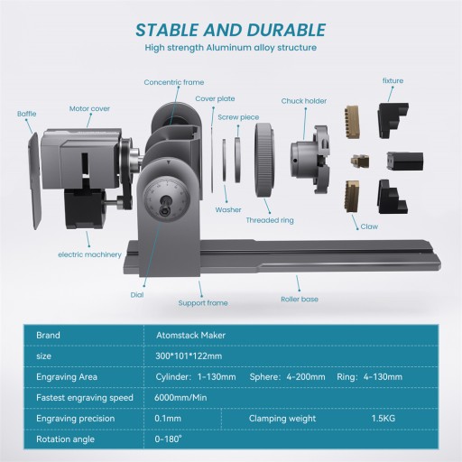 ATOMSTACK MAKER R1 Pro Uchwyt i rolka obrotowa do grawerowania laserowego, Obrotowa rolka laserowa 4 w 1, Regulowany uchwyt 180° z 3 szczękami do grawerowania pierścieni, obiektów kulistych i cylindrycznych, przedmiotów o nieregularnym kształcie