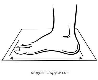 Obrysowujemy stopę dziecka na kartce papieru , palce muszą być wyprostowane . Robimy swobodny obrys , następnie określamy długość odrysowanej stopy mierząc odcinek od pięty do końca dużego palca. Do otrzymanego wyniku dodajemy od 0,5 - 1 cm .