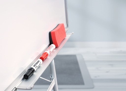 Dół tablicy flipcharta wykończony jest półką na markery, gąbkę lub zestaw magnesów.