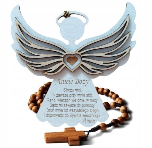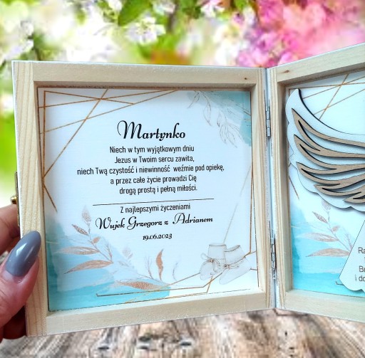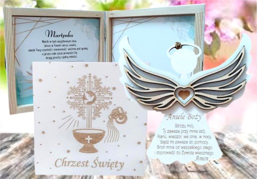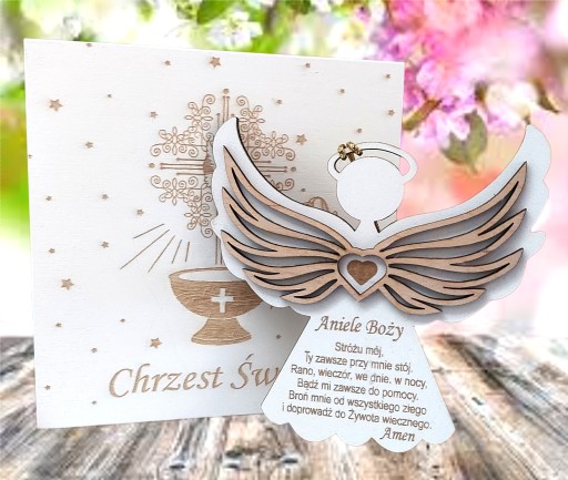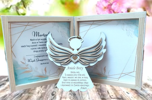 Drewniany Anioł ma wymiary 12x12cm i wygrawerowaną modlitwę "Anioł Stróż " Można go wyjąć i zawiesić w pokoiku dziecka. Ta wyjątkowa pamiątka będzie miłym wspomnieniem a także niezwykłą pamiątką bo pudełeczko może służyć potem jak schowek na drobiazgi.