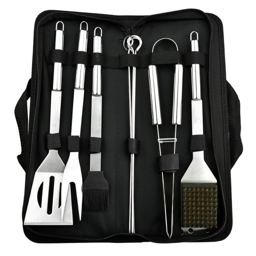 Zestaw przyborów do grillowania i szczotki do czyszczenia grilla zapakowany w pokrowiec umożliwiający łatwe przechowywanie oraz wygodny transport.
