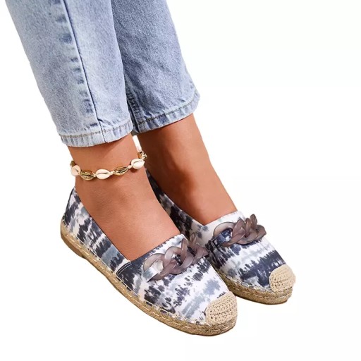 Lekkie damskie espadryle wykonane w całości z materiału tkaninowego. Podeszwa wykończona sznurkiem jutowym. Okrągły nosek posiada plastikową ozdobę. Model zdobiony ciekawym printem. Idealne na lato!