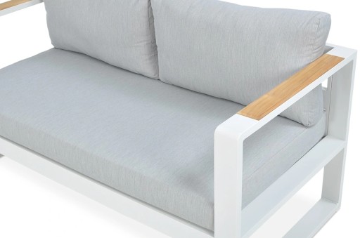 4 meble i różne zastosowania: Zestaw wypoczynkowy Panama White składa się z 2-osobowej sofy, 2 rozkładanych foteli i stolika kawowego. Wszystkie elementy łączą w sobie świetny design, solidne wykonanie i doskonałą trwałość. Zestaw mebli ogrodowych Panama wykonany jest z aluminium, lekkiego, ale niezwykle wytrzymałego materiału. Zestaw Panama White nie ulega zniszczeniu pod wpływem opadów atmosferycznych, ekspozycji na światło słoneczne czy nagłe zmiany temperatury. Trwałość aluminiowych mebli tarasowych sprawia, że są one doskonałym wyborem dla najbardziej wymagających użytkowników. White Panama Lounge można zainstalować we własnym ogrodzie, w salonie lub na tarasie hotelu lub restauracji. Wygląda świetnie w każdym miejscu i zapewnia użytkownikom najwyższą wygodę. Charakterystycznym elementem estetycznym Panama White Lounge Set są niewątpliwie drewniane wstawki na fotelach i podłokietnikach sofy. W skład zestawu mebli ogrodowych wchodzą duże, miękkie poduszki na siedzisko i oparcie. Co więcej, zestaw mebli wypoczynkowych Panama jest bardzo łatwy w utrzymaniu czystości. Nie jest wymagana żadna dodatkowa konserwacja, aby zapobiec rdzy, a brud można zwykle usunąć wodą.
