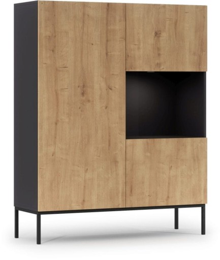 Witryna Lanzzi to praktyczny mebel o niebanalnym designie, który sprawdzi się szczególnie w pomieszczeniach o stylu industrialnym i loftowym. Otwarta przestrzeń, to doskonałe miejsce do wyeksponowania dekoracji lub pamiątek, a 2 drzwiczki, za którymi znajdują się półki oraz 1 szuflada pozwolą na przechowywanie dużej ilości ubrań czy innych przedmiotów. Niebanalna stalowa podstawa sprawia, że mebel prezentuje się niezwykle nowocześnie i oryginalnie. Witryna Lanzzi to wspaniałe uzupełnienie mebli z tej serii, które znajdą Państwo w naszej ofercie.