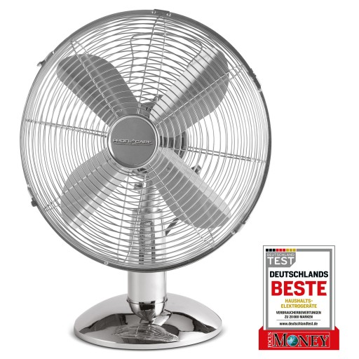 ProfiCare PC-VL M to wysokiej jakości wentylator biurkowy o średnicy 25 cm - to odpowiednia wielkość, aby szybko ochłodzić gorące powietrze w pomieszczeniu. Dzięki długim, metalowym skrzydłom osiąga prawie 40% lepsze wyniki w cyrkulacji powietrza w porównaniu do innych wentylatorów. Solidna, metalowa budowa to gwarancja trwałości urządzenia a kratka osłaniająca wirnik zwiększa bezpieczeństwo jego użytkowania. Możesz go włączyć bez obawy, nawet gdy w domu jest małe dziecko. Trzy stopnie mocy oraz regulowany kąt nachylenia pozwalają na łatwe dostosowanie pracy urządzenia do Twoich potrzeb. Chromowana obudowa w stylu retro pasuje do pomieszczeń urządzonych w każdym stylu. Wentylator posiada funkcję oscylacji, dzięki której może obracać się chłodząc większą powierzchnię.