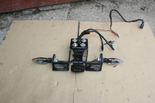 Oryginalne mocowanie tablicy wraz z podświetleniem firmy R&G oraz z kierunkowskazami firmy Barracuda w stanie bardzo dobrym do Kawasaki ZX10R 08-10.