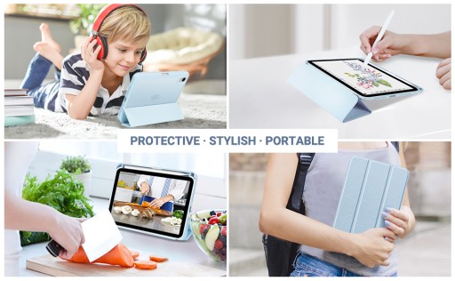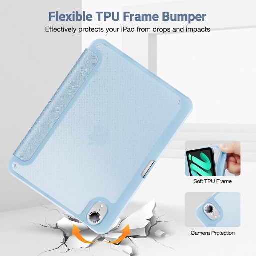 - Elegancka osłona przednia o wyjątkowej jedwabistej fakturze, elastyczna ramka z TPU i miękka wyściółka z mikrofibry chronią iPada przed wstrząsami, upadkami i zadrapaniami. Półprzezroczysta matowa twarda tylna okładka eksponuje ikonę Apple i zapobiega pozostawianiu odcisków palców