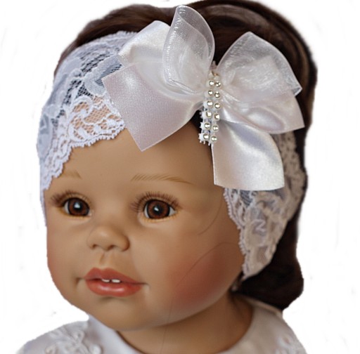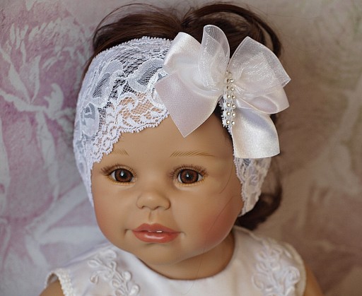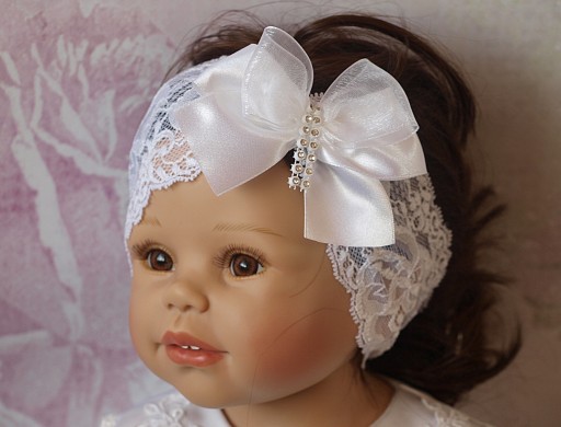 Mamy zaszczyt zaprezentować Państwu śliczną opaseczkę pochodzącą naszej pracowni. Opaseczka wykonana jest z białej z lekkim odcieniem niebieskiego miękkiej i elastycznej koronki. Bardzo łatwo dopasowuje się do główki dziecka jest bardzo wygodna a przy tym elegancka i niepowtarzalna dzięki naszej ręcznie robionej ozdobie.