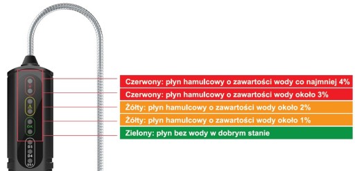 - Zielony/żółty/żółty/czerwony: płyn hamulcowy o zawartości wody około 3%, zaleca się wymianę płyn hamulcowy.