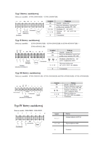 Kolejno do zacisków L1/R, L2/S podłączamy zasilanie główne 1x230V (przy zasilaniu przemiennika z 1-fazy) R,S,T podłączamy zasilanie główne 3x400VAC (przy zasilaniu przemiennika z 3-faz). Zaciski U,V,W to zaciski silnika. Pomiędzy zaciski PP a PB mamy możliwość podłączenia zewnętrznego rezystora hamowania – w całym typoszeregu moduł hamowania jest wbudowany w standardzie. Nie musimy się martwić o obecność modułu – gdy mamy potrzebę gwałtownego hamowania, dołączamy jedynie rezystor. Zacisk E pełni rolę zacisku ochronnego (PE).