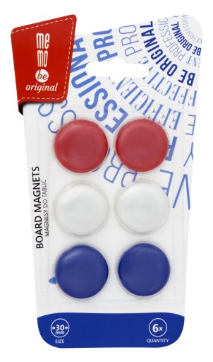 Magnesy do tablic MemoBe. Zestaw okrągłych magnesów do tablic i innych powierzchni magnetycznych. Plastikowa obudowa nadaje magnesom estetyki. Doskonałe wsparcie podczas prezentacji informacji i grafik. W zestawie 6 szt. o śr. 30 mm, opakowanie blistrowe.