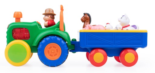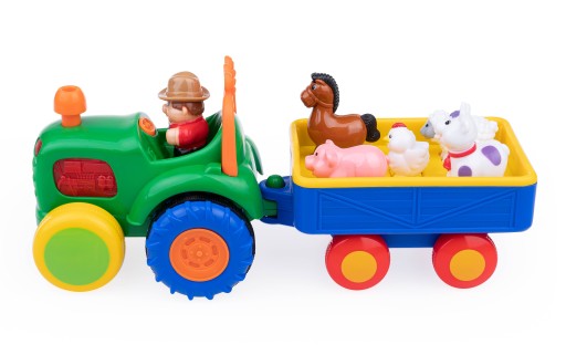 Traktor samodzielnie jeździ, wydając realistyczny odgłos, zapalają się w nim światełka, a farmer śpiewa wesołą piosenkę. Na przyczepce znajduje się 5 zwierzątek, które nagrodzą dzieci realistycznymi odgłosami bądź zabawną rymowanką za każdym razem, gdy odgadną prawidłowy kształt i umieszczą je w odpowiednim miejscu.