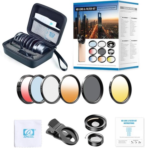 - 7 filtrów na obiektyw telefonu (czerwony, pomarańczowy, żółty, niebieski, filtr CPL 52 mm, filtr 52 mm ND32, 52 mm 6-ramienna gwiazda)