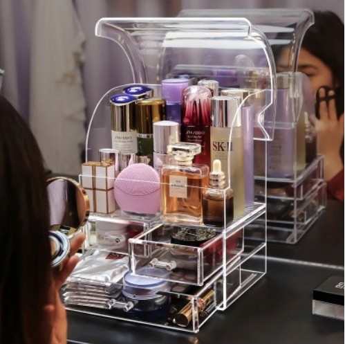 Zamykany przezroczysty organizer/pojemnik na kosmetyki odporny na wilgoć i pyłki - ułatwi przechowywanie kosmetyków bez kurzenia się. Doskonały element wyposażenia wnętrza ułatwiający utrzymanie porządku wśród kosmetyków. Transparentny, zamykany organizer, dzięki któremu uporządkujemy swoje wszystkie kosmetyki i będziemy je mieć zawsze pod ręką. Piękny i praktyczny, będzie stanowić estetyczny element wyposażenia sypialni bądź toaletki. Jednocześnie jest bardzo praktyczny - umożliwia utrzymanie porządku i nadaje się do przechowywania zarówno kosmetyków jak i biżuterii bądź innych drobnych przedmiotów. Dzięki zamknięciu przedmioty nie będą się kurzyć tylko pozostaną w stanie idealnym. Doskonały element wyposażenia zarówno dla stylistek, jak i kobiet oraz nastolatek, które posiadają duże ilości kosmetyków.