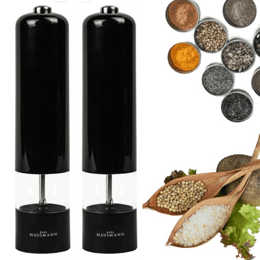 Zestaw młynków elektrycznych marki Karl Hausmann. Obudowa młynka z tworzywa sztucznego w kolorze czarnym. Całość zapakowana w pudełko PVC.