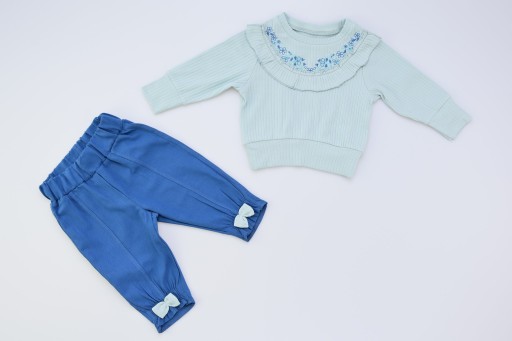 - Niebieskie spodnie. Szeroka guma w pasie. Na zakończeniach nogawek ozdobne, zielone kokardki.