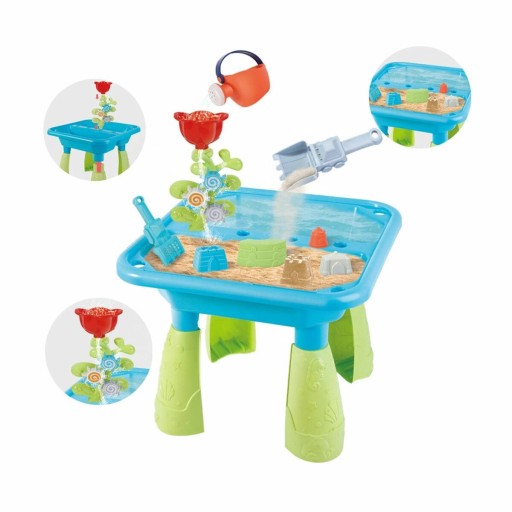 Do stołu dołączane są akcesoria, takie jak łopatka, konewka, foremki, które umożliwiają jeszcze większą różnorodność zabawy.