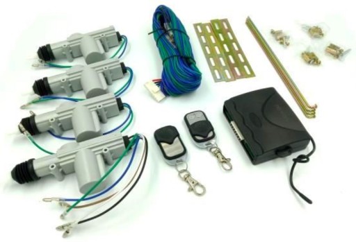 Komplet uniwersalnego zamka centralnego na 4 drzwi. Siłowniki mają obrotowe głowice. Zestaw ten cechuje bardzo łatwy montaż. Do podłączenia elektrycznego wymagane są tylko 2 przewody (+12V i masa) reszta to montaż mechaniczny siłowników w drzwiach i rozprowadzenie przewodów. Zamek jest sterowany z kluczyka z drzwi kierowcy lub za pomocą pilota. Ma także dodatkowe wejście do sterowania z innego urządzenia (alarmu, sterownika radiowego, włącznika itp.).