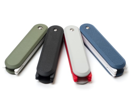 Ochronny futerał do przechowywania kart pamięci SD w kształcie poręcznego scyzoryka z odchylanymi szufladami na karty.