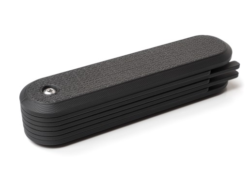 Ochronny futerał do przechowywania kart pamięci SD i microSD w kształcie poręcznego scyzoryka z odchylanymi szufladami na karty.
