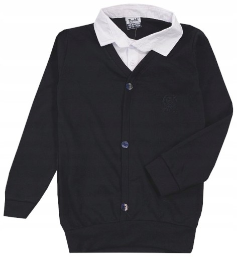 Koszula, a właściwie sam kołnierzyk w kolorze białym, kardigan granatowy, doszyty, nierozpinany ! Guziki tylko na ozdobę. wykończony ściągaczami, na łokciach ozdobne łaty, a na piersi haft.