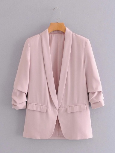 Doskonałe dopełnienie stylizacji do pracy, na uczelnie lub na wieczorne wyjście. Oryginalnego charakteru dodają drapowane rękawy o długości 3/4. Imitacja kieszonek po bokach z efektownymi klapami upiększają marynarkę. Fason luźny, z podszewką i miękkimi poduszkami w ramionach.