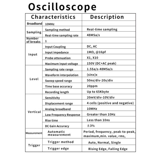 Ten miernik jest zintegrowany z funkcją oscyloskopu i multimetru, z pełnoekranowym wyświetlaczem IPS o przekątnej 2,8 cala, o wysokiej rozdzielczości i dużej czcionce do łatwego odczytu danych, co sprawia, że można go stosować do różnych pomiarów w złożonym środowisku. Obsługuje funkcje multimetru napięcia AC/DC, prądu AC/DC, rezystancji, pojemności, diody, częstotliwości i pomiaru temperatury oraz testu włączania/wyłączania obwodu. I funkcje oscyloskopu pełnego pomiaru przebiegu, z jednokanałową szerokością pasma 10 MHz i częstotliwością próbkowania w czasie rzeczywistym 48MSa/s. Z wysoką dokładnością, dużą prędkością, wysoką czułością i wieloma trybami pomiaru i może być szeroko stosowany w testowaniu i debugowaniu prac w dziedzinie elektroniki, komunikacji, komputerów itp.