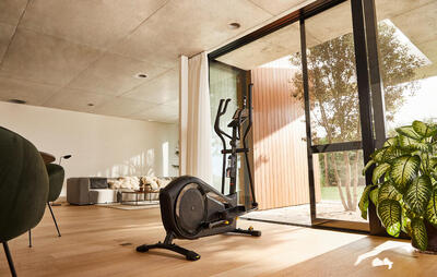 Rower eliptyczny zaprojektowany przez nasz zespół z myślą o regularnym użytkowaniu mogącym przekraczać 7 godzin tygodniowo. Chcesz ćwiczyć przed oknem (lub przed telewizorem), ale w pobliżu nie ma gniazdka? Nie potrzebujesz go! Rower eliptyczny 540 jest zasilany Twoimi ruchami. Jego mocna strona? Długość kroku 39 cm.