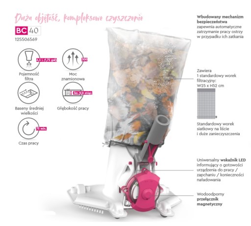 Duży zbiornik 6,5 l pozwala na efektywne zbieranie dużej ilości zanieczyszczeń i liści. Odkurzacz BC40 jest niezwykle wydajny i przefiltrowuje aż 300 l wody na minutę.